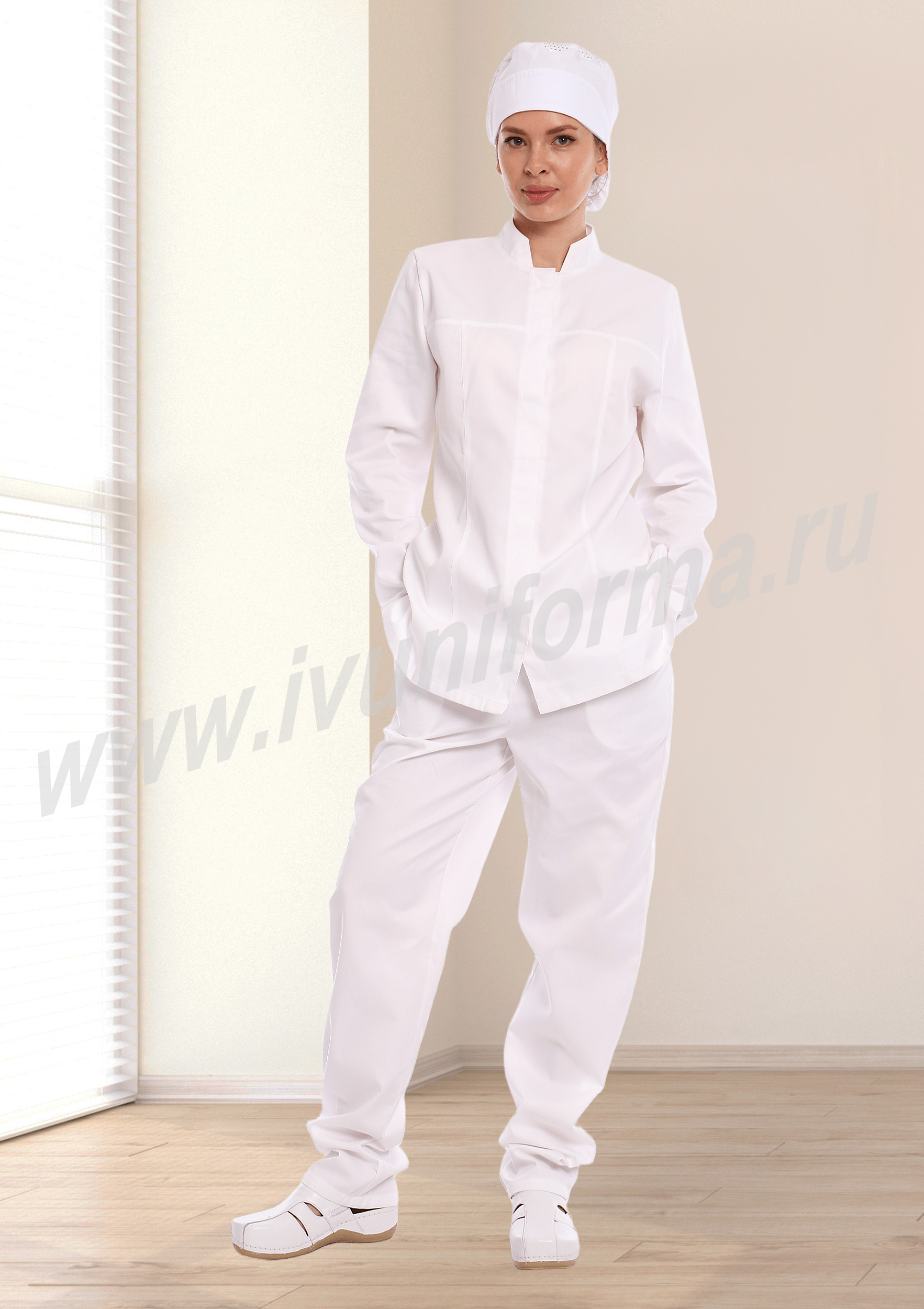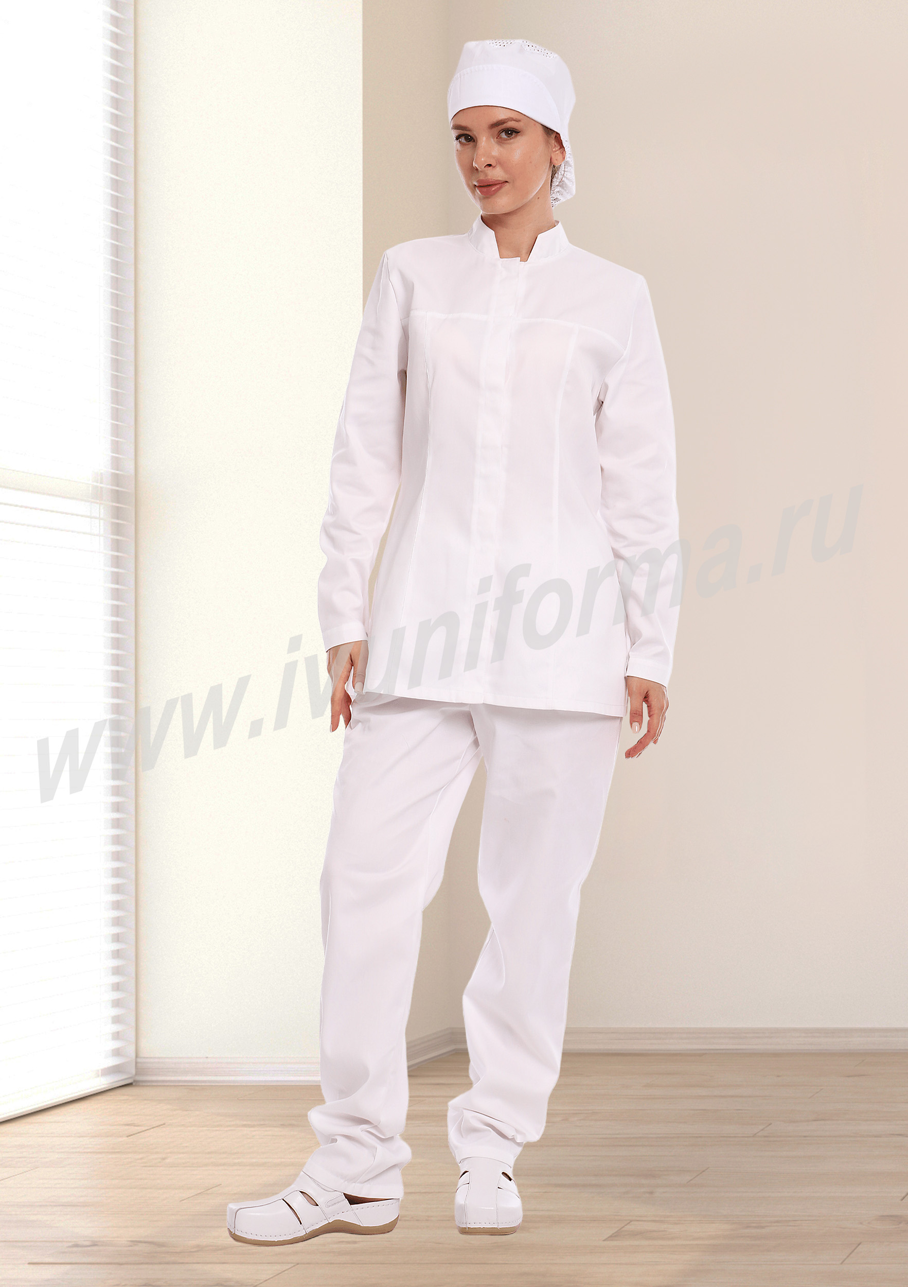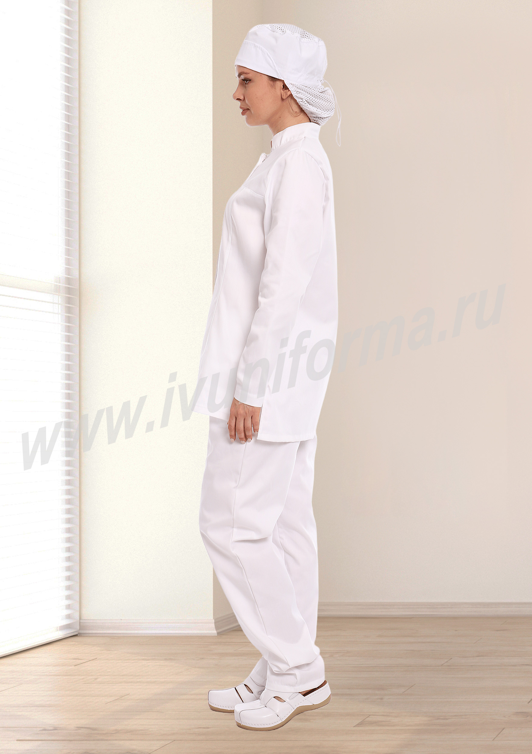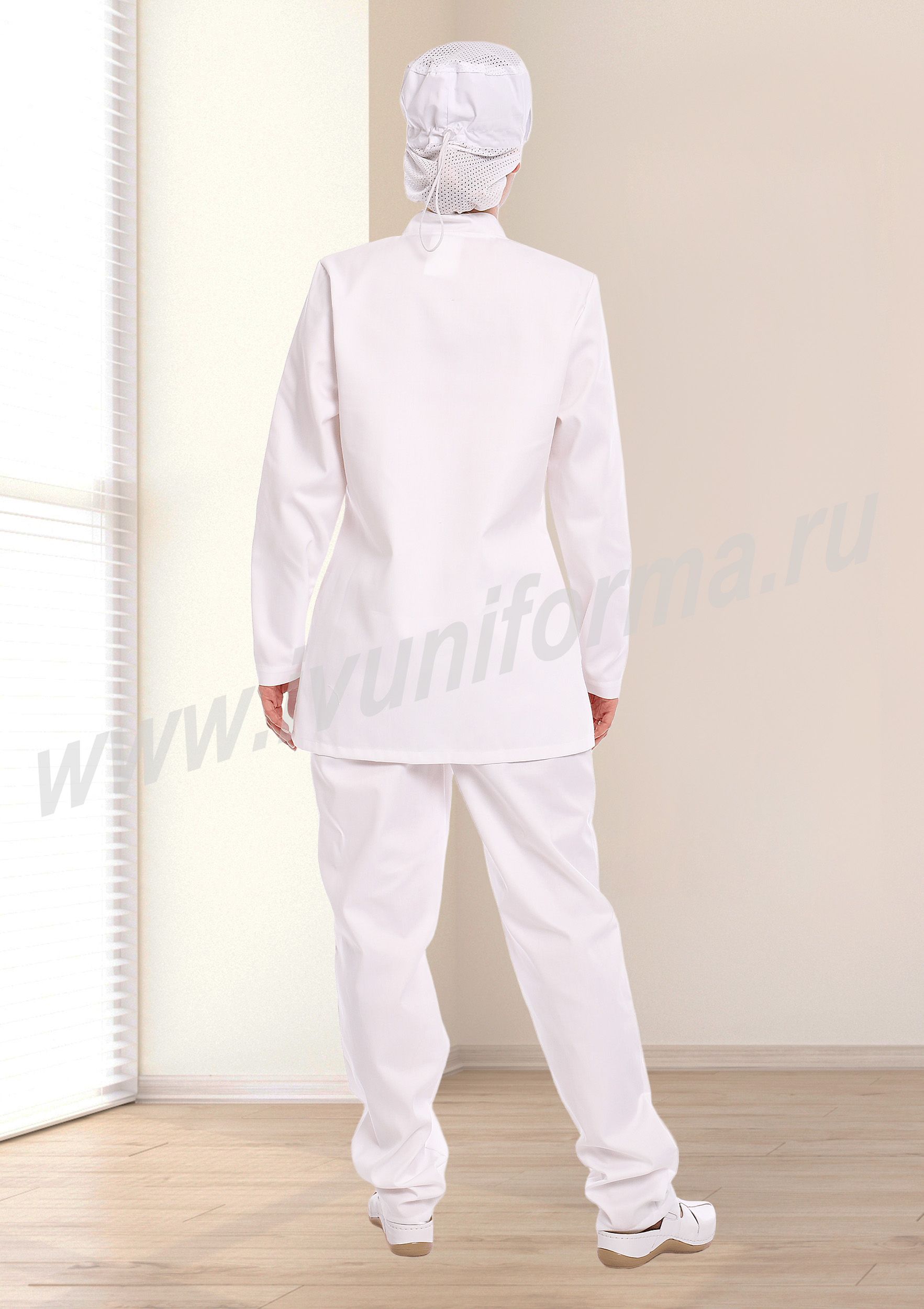 Костюм женский состоит из куртки и брюк. Куртка удлиненная полуприлегающего силуэта с центральной потайной супатной застежкой на кнопки. Комфортная посадка на фигуре обеспечивается за счет рельефных швов на полочке и отрезных кокеток. Спинка со средним швом. Рукав втачной длинный, прилегание рукава по низу регулируется кнопками. Воротник-стойка придает изделию простоту и элегантность. В боковых швах блузки предусмотрены разрезы для легкого доступа в карманы брюк. Брюки прямые на эластичном поясе со вставкой для комфортной посадки на талии и верхними боковыми карманами с наклонным входом. Костюм предназначен для защиты от общих производственных загрязнений. Модель разработана в соответствии с международными требованиями безопасности пищевого производства согласно системе НАССР (ХАССП).