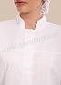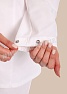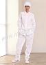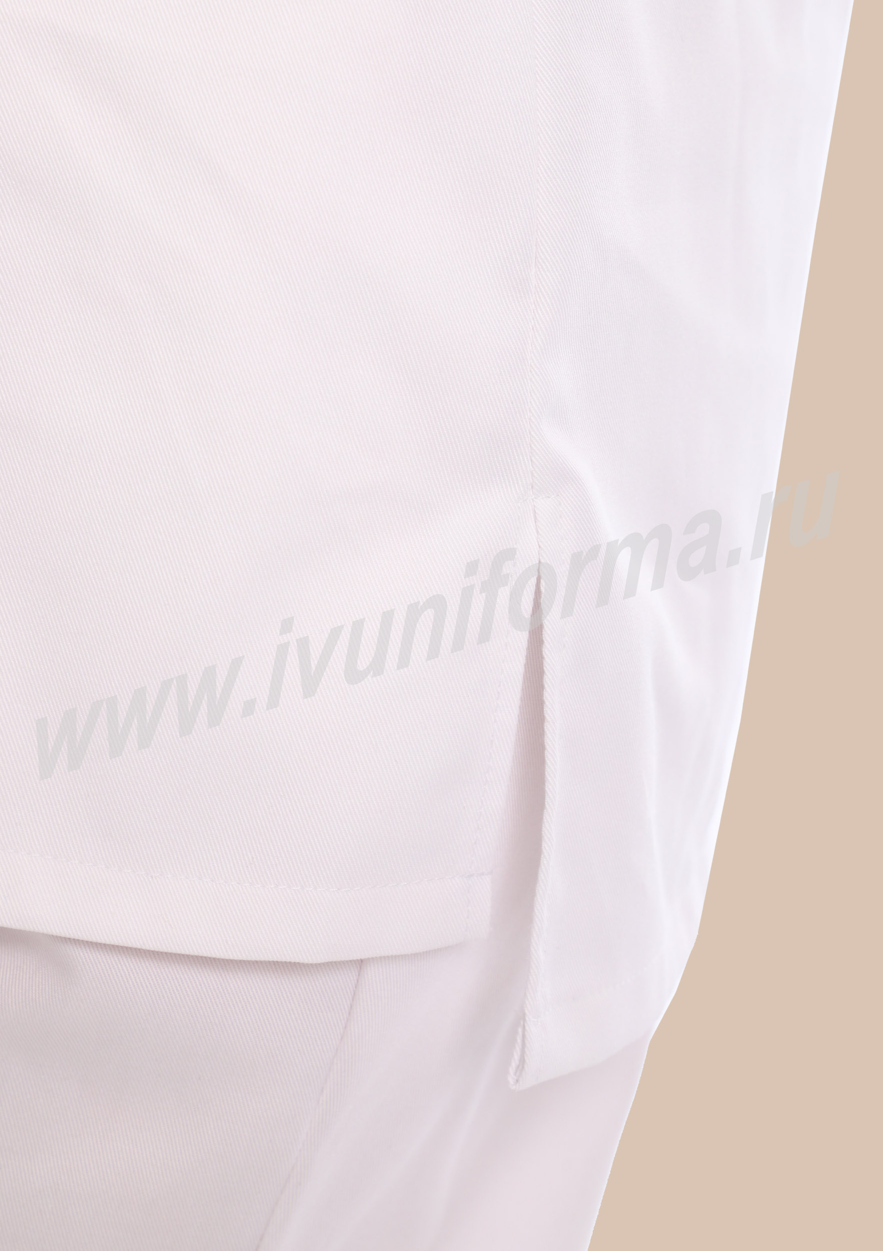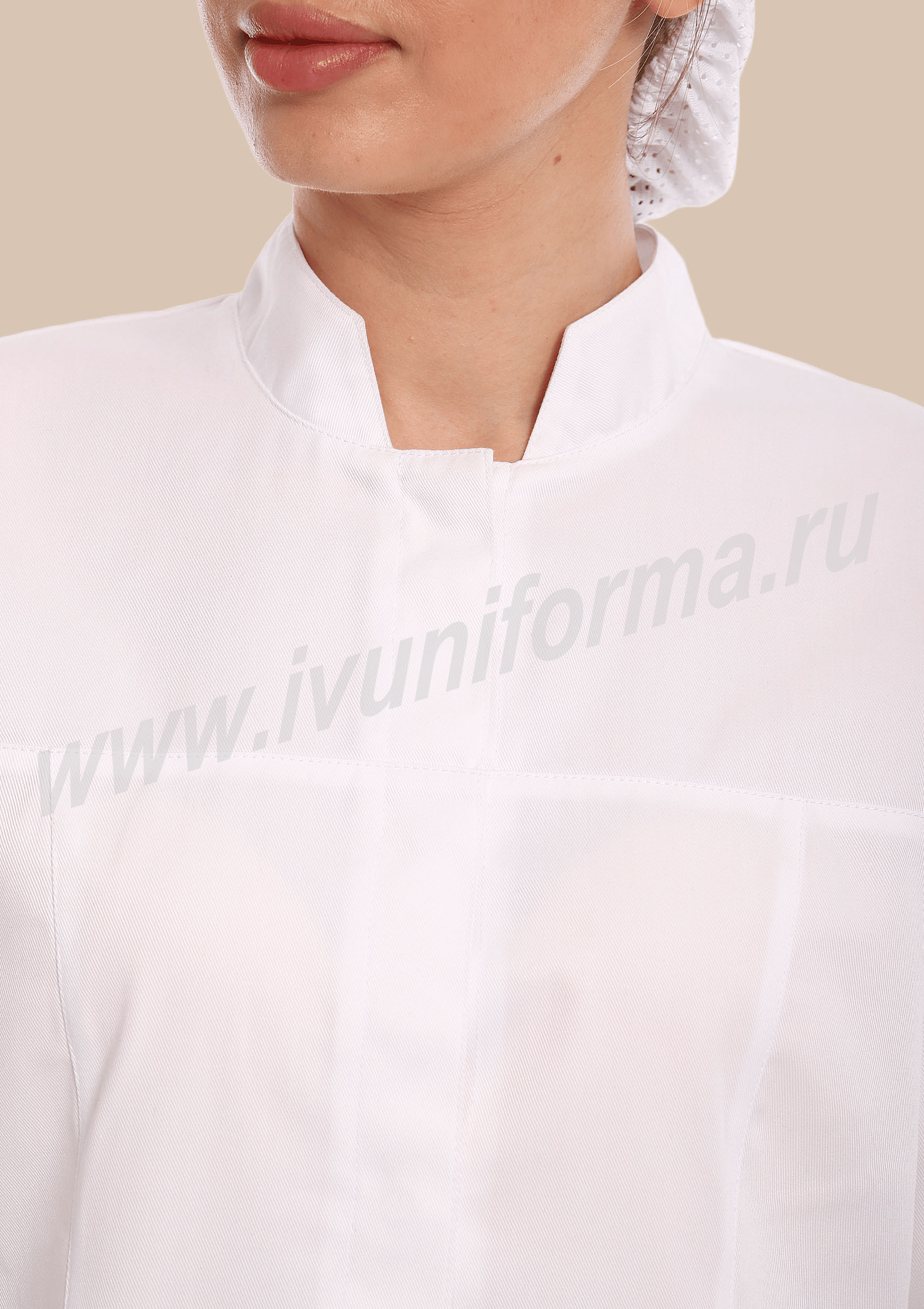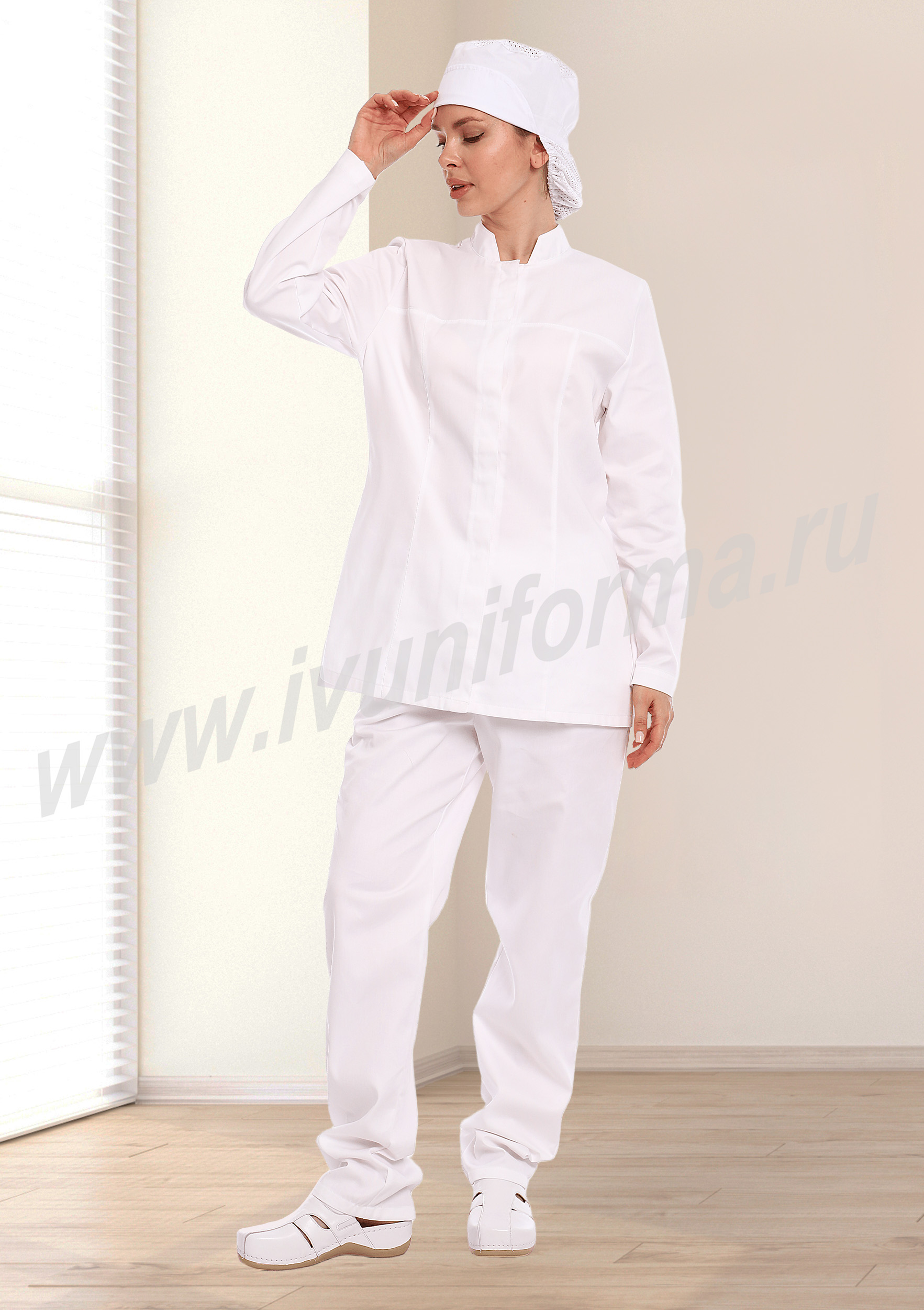Костюм женский состоит из куртки и брюк. Куртка удлиненная полуприлегающего силуэта с центральной потайной супатной застежкой на кнопки. Комфортная посадка на фигуре обеспечивается за счет рельефных швов на полочке и отрезных кокеток. Спинка со средним швом. Рукав втачной длинный, прилегание рукава по низу регулируется кнопками. Воротник-стойка придает изделию простоту и элегантность. В боковых швах блузки предусмотрены разрезы для легкого доступа в карманы брюк. Брюки прямые на эластичном поясе со вставкой для комфортной посадки на талии и верхними боковыми карманами с наклонным входом. Костюм предназначен для защиты от общих производственных загрязнений. Модель разработана в соответствии с международными требованиями безопасности пищевого производства согласно системе НАССР (ХАССП).